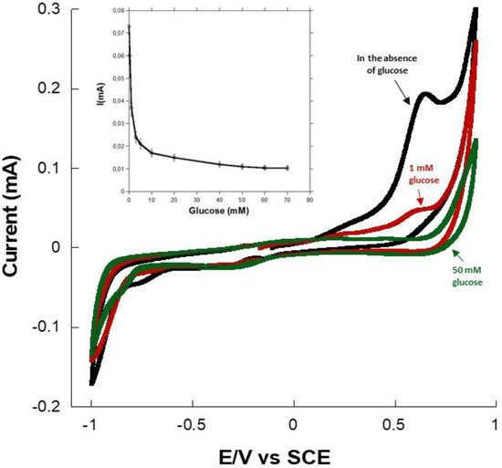 Figure 6 shows the CV of a PMG-modified gold electrode containing ALDR and NADPH, in the absence and in the presence of glucose (at 2 mV·s−1). Herein, we observed that in the absence of glucose, the CV exhibited an oxidation peak at +0.62 V vs. Ag/AgCl, corresponding to the catalytic oxidation of NADPH to NADP. However, when glucose was added to the buffer solution, we observed a decrease in the oxidation intensity. Moreover, when the concentration of glucose increased to 50 mM, the oxidation peak of NADPH completely disappeared. Indeed, the NADPH oxidation peak on the CV curves (Figure 5 inset) decreased as the concentration of glucose increased in the solution. At a high glucose concentration, the NADPH oxidation peak completely disappeared. The presence of glucose drove the enzymatic oxidation of NADPH to NADH by ALDR, which involved a decrease of the NADPH concentration on the surface of the electrode and, consequently, a reduction of the NADPH oxidation current [38]. When the concentration of glucose is high, all the NADPH molecules are oxidized to NADP by ALDR, and no NADPH oxidation current can thus be observed, since there is no NADPH on the surface of the modified electrode. Inset Figure 5 shows the evolution of the NADPH CV oxidation current at 620 mV with the glucose concentration, and we can see that the oxidation current decreased with the decrease of the glucose concentration. This decrease exhibited a linear behavior until 3 mM, and after that, the biosensor deviated from linearity and saturated thereafter.