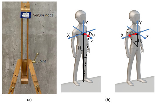 The sensor node was mounted on a dedicated structure, shown in Figure 1a, allowing for miming Stable behaviors (ST), Antero-Posterior (AP) and Medio-Lateral (ML) dynamics, and overall instable behaviors (INST). The node was positioned at a height from the floor corresponding to standard chest positions. This choice was strictly related to the need of acquiring a consistent dataset of different standing postural behaviors without the need, during this development phase, of annoying real patients.