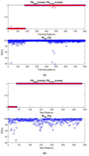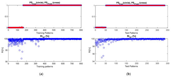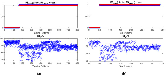 Figure 8 shows the results obtained in the case of the optimal range of influence, both for the training and test datasets. In particular, the comparison between the predicted and expected postural status is shown, along with the reliability index. The results obtained demonstrate the suitable performance of the DWT-NF approach.
