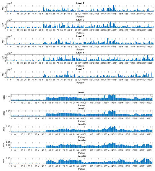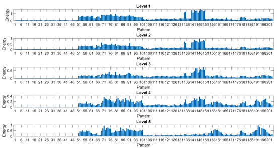 Figure 6 shows features (8)–(10) estimated by the DWT for each of the computed levels. As expected, the contribution of the first two levels is negligible and is not used to feed the NF algorithm [30]. Only a limited number of features are shown in the picture for the sake of readability.