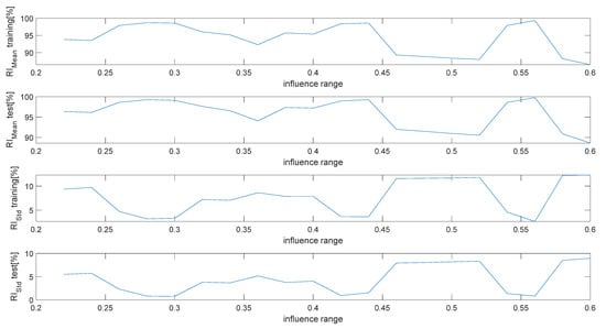 The results shown in Figure 7, representing the behavior of such quantities as a function of the range of influence, allow for fixing the latter to the optimal value of 0.3.