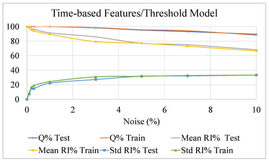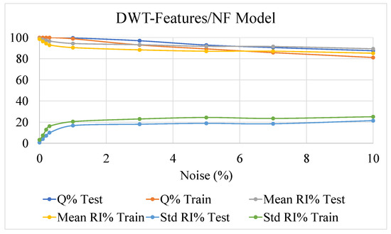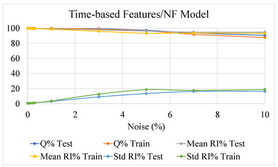 The behavior of the Neuro Fuzzy inference systems fed by time-based features, as a function of different levels of noise added to the dataset. Results for indexes (6), (13), and (14) calculated for reliability index (7) are shown.