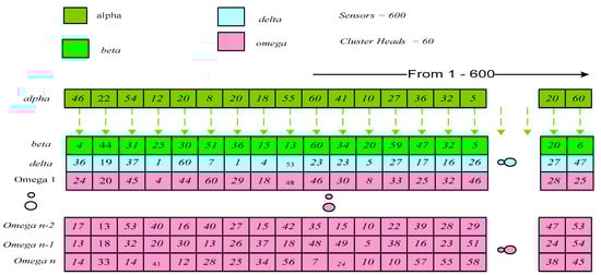 - Threshold distance: The threshold distance of sensors from the CH is determined and used to generate the initial solution space. Here, Max_G is the maximum loaded CH with p number of sensors connected and Min_G is the minimum loaded CH associated with q number of sensor nodes. S is the total set of p and q, and the sensor connected to these CHs is the union of both groups as it is given in (2),