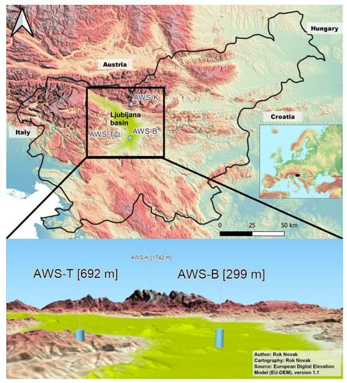 Measurements were collected from three automatic weather stations (AWS), one low-lying station located in the center of Ljubljana (station Bežigrad—AWS-B), one medium-lying station situated on a hill at the border of the basin (Topol—AWS-T) and one high-lying station at the northern border of the basin (Krvavec—AWS-K), shown in Table 1 with their respective elevations, coordinates, and collected parameters. The stations cover the central, western, and northwestern parts of the Ljubljana basin, as shown in Figure 2. All stations measure and report air temperature at 2 m above ground, at 7:00, 14:00, and 21:00, each day.