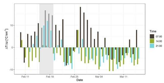 Figure 3 shows the ΔT/Δz values calculated for the period from 10 February to 15 March 2019 to provide some context for the observed ATIs and patterns in the fluctuations of ΔT/Δz [°C/km]. An ATI is defined by ΔT/Δz > 0 °C/km, which is present several times in Figure 3, most frequently in the mornings (colored black) when the temperatures in the valley were still lower than in higher elevations. This pattern indicates diurnal inversions, formed every night due to radiative cooling of the soil, producing a very stable surface layer particularly associated with alpine valleys [].