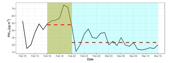 Measured daily PM10 concentrations in the observed period from 10 February to 15 March 2019, collected from AWS-B. Persistent ATI period with a latent increase of PM concentrations shaded green, the post-ATI period included in the analysis shaded blue. Dashed red lines show mean PM10 values for each period.