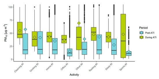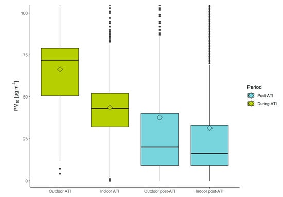 Calculated exposure to PM10 indoors and outdoors in the period with a persistent ATI event (in green) and the post-ATI period (blue), collected from the PPM devices. Values above 100 µg/m3 were removed from the plot to better visualize the differences between mean (diamond) and median values (line).