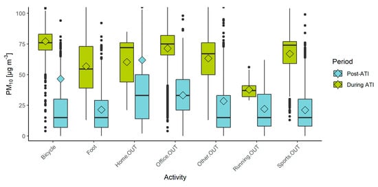 Figure 7 illustrates the differences between the distribution, mean, and median values of PM10 for all outdoor activities during the ATI period and post-ATI. Almost all outdoor activities show higher recorded values during the ATI period than the post-ATI period. The differences range from 15.7 µg/m3 for running to 45.9 µg/m3 for outdoor sports that don’t include running, with the exception of the “home” activity, which was higher during the post-ATI period by 1.7 µg/m3. A possible explanation for a higher concentration would be that outdoor activities around the home can include gardening, burning of gardening and agricultural residues [], and home-improvement activities that often include some kind of construction (sanding wood, mixing cement, demolishing objects, etc.) which present a source of particulate matter [,]. Such activities can be expected to occur more frequently during the post-ATI period with clearer weather and could elevate the concentrations of PM10. Participants could also differently interpret specific outdoor “home” activities, e.g., resting on a semi-enclosed balcony. Although the mean values do not differ much for the “Home.OUT” activity, the median values show that there is still a difference between these two time periods and indicate that the higher mean value of outdoor activities in the post-ATI period could be influenced by a few high-exposure events. For illustration, if the high-exposure events (>100 µg/m3) are removed, the mean value decreases from 61.9 µg/m3 to 30.1 µg/m3, while the median value drops from 33 µg/m3 to 27 µg/m3.