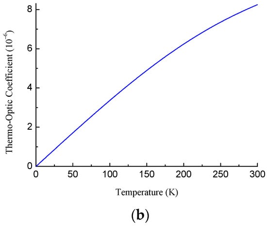where the temperature is measured in Kelvin. There is no linear term in this sum, because it is known that the thermo-optic coefficient goes to zero as the temperature approaches 0 K [,,]. The curve has a parabola shape at 0 K. This is experimentally corroborated by the fact that gratings are essentially insensitive to temperature changes near 0 K [,,,]. Thus, we extrapolated the refractive indices down to 0 K and the results show that the equation obtained by Leviton and Frey may be applied to lower temperatures.