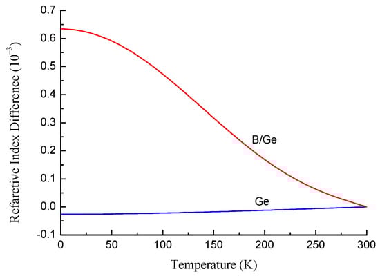 Refractive index difference between Ge- and B/Ge-doped silica and pure silica as a function of temperature.