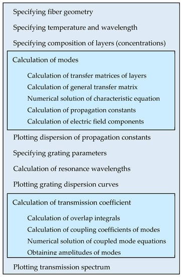 The core and the cladding have different thermal expansion coefficients, and they are deformed inhomogeneously with temperature. The solution of the problem is known, but it is too cumbersome, its effect is small, and the thermal expansion coefficients of doped silica are unknown. Moreover, when we use the refractive index difference shown in Figure 3, we already take the thermal expansion effect on the refractive index into account. Therefore, we do not specifically consider thermal expansion in our calculation of refractive index. The temperature behavior of FBGs and LPFGs can be used in future studies to estimate the thermal expansion coefficient of the fiber core and cladding.