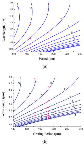 Boron–germanium-doped fiber is another type of fiber that is used for the inscription of LPFGs. Arc-induced gratings in this fiber produce prevailing symmetric perturbations in the core and excite the LP0j cladding modes []. These modes have somewhat different dispersion curves due to other mode symmetry and significantly different parameters of the B/Ge fiber itself. The dispersion curves for LP0j cladding modes of two B/Ge fibers are demonstrated in Figure 6: (a) B/Ge#1 and (b) B/Ge#2. The following parameters for the fiber were used to obtain the best fit of the experimental data: B/Ge#1— μm, μm, , ; B/Ge#2— μm, μm, , and . The experimental data points were taken from previous studies []. The dispersion curves for the B/Ge#1 fiber lie lower than for the B/Ge#2 fiber, and resonances of modes LP0j with were experimentally measured, while modes with starting from 1 are seen for the B/Ge#2 fiber. Three modes with have dispersion turning points in the presented range for B/Ge#1 fiber at wavelengths 1.54, 1.46, and 1.38 μm, respectively, and one dispersion turning point for the mode with for the B/Ge#2 fiber at 1.54 μm.