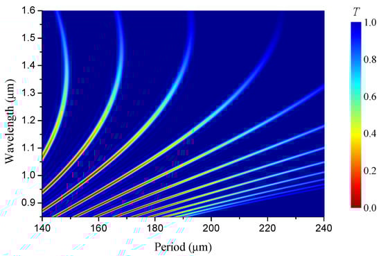 In order to illustrate how sensitivity and figure of merit depend on the grating period and wavelength, we demonstrate it in Figure 8 with the spectrum of LPFGs in the B/Ge#1 fiber as a function of the grating period. Each vertical line represents a spectrum in color form. One can see that the width of the spectral resonances slowly grows with mode number. The amplitudes decrease with wavelengths. The thickness of each curve increases slightly with wavelength; however, the spectral width, which is measured along the wavelength axis, increases strongly with the angle of the curve slope and is inversely proportional to its cosine. So, at the turning point, the curves have slopes that are close to vertical yielding high sensitivities, but their spectral widths are very large, so that the figure of merit is not improved.
