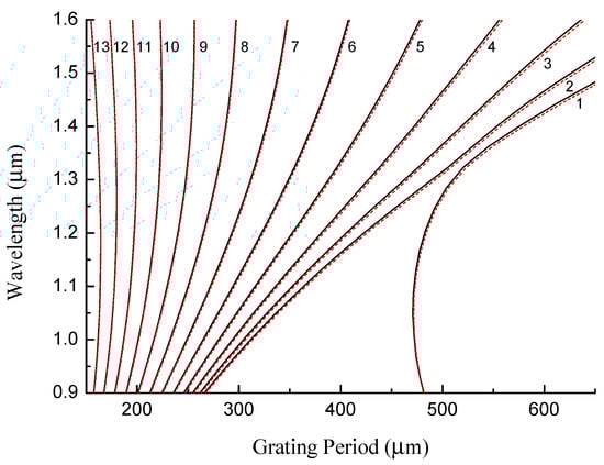 In general, the resonance wavelengths increase with the grating period, while the slope of the curve grows with the mode number. For mode numbers greater than 10, the curve becomes close to a vertical line with some curvature resulting in a two-valued function of wavelength on the period. The apex of the curve is the so-called “turning point”. The first turning point appears for an LPFG with a period of 225 μm at 1.46 μm for the LP1,10 mode. The next modes have turning points at lower wavelengths.