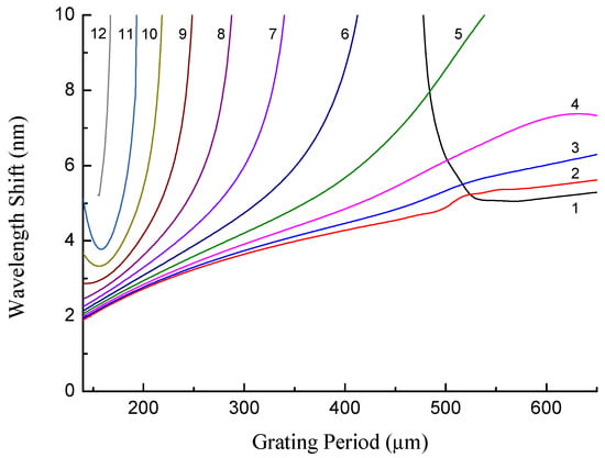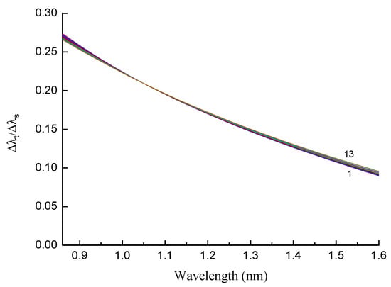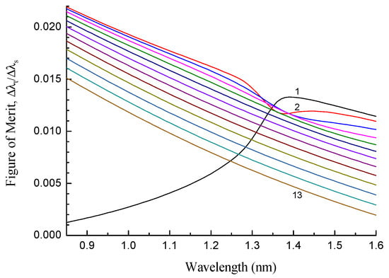 The dependence of the figure of merit for a 20 mm grating in the B/Ge#1 fiber is demonstrated in Figure 15 for modes LP11–LP1,13 and . The curves for different modes almost coincide and decrease monotonically with wavelength. Thus, in terms of the figure of merit, it is preferable to use shorter wavelengths independently of the mode number. The period should be chosen so that a resonance at a certain wavelength is obtained. As we can see by comparing this with Figure 10, the figure of merit for the B/Ge fiber is one order of magnitude higher than for the standard fiber. The figure of merit is not improved near the DTP, because the high sensitivity is compensated by a wider resonance width.