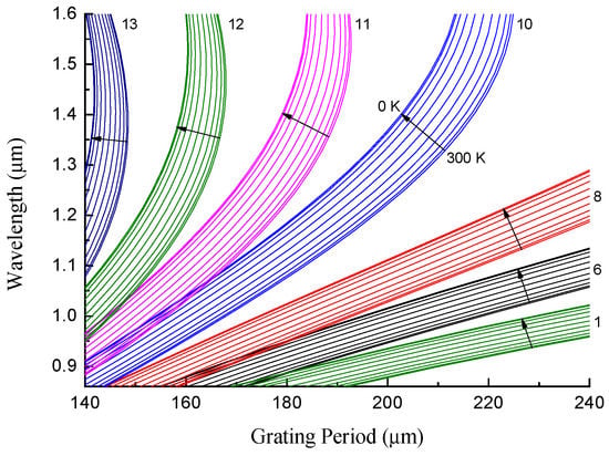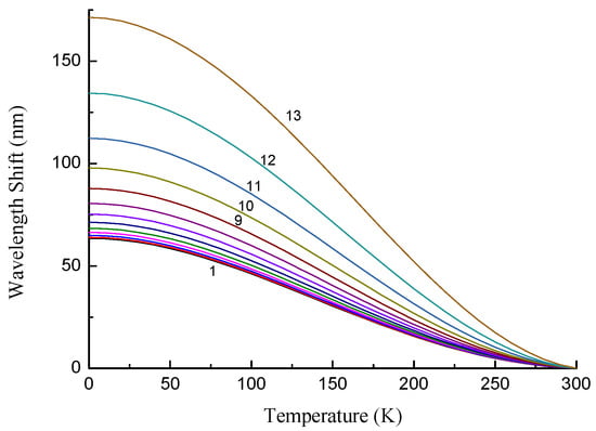 Let us consider the behavior of the B/Ge fiber gratings at cryogenic temperatures. Figure 12 depicts series of dispersion curves for 13 modes at temperatures from 300 K to 0 K with a step of 30 K for the B/Ge#1 fiber. The resonance wavelengths are red-shifted with decreasing temperature, if the range before the dispersion turning point is considered. The curves become more condensed when approaching 0 K.