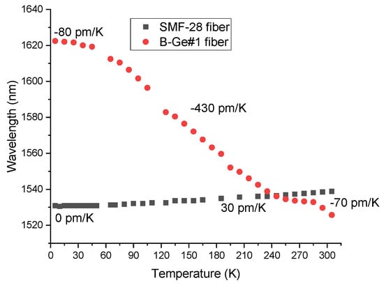Wavelength shift in B/Ge#1 fiber for the resonances at 1.3 μm as a function of temperature.