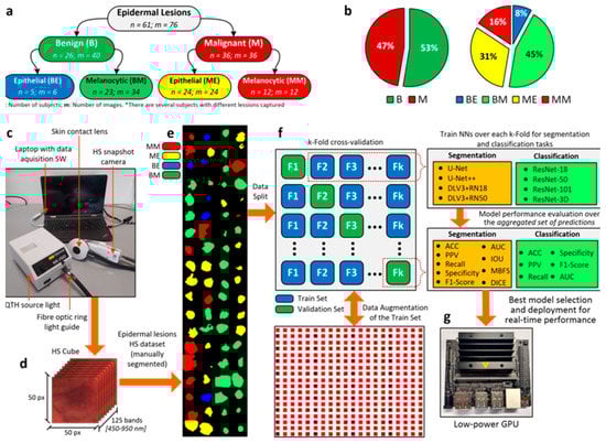 The main contribution of our work is the proposal of a DL pipeline comprising eight different architectures for the classification and segmentation of HS in vivo skin lesion images (Figure 1). Enhanced by data augmentation, transfer learning, and extensive hyperparameter tuning, we trained the networks with a database composed of 76 HS epidermal lesions from 61 patients []. Pathologists and dermatologists diagnosed suspected malignant lesions through biopsy-proven histological assessment to evaluate the tumor etiology, categorizing each lesion in the proposed taxonomy (Figure 1a,b). Data were captured using a customized HS acquisition system [] (Figure 1c) and segmentation masks originated from the HS cubes (Figure 1d) to delimit the lesion boundaries in the images (Figure 1e). In particular, dermatologists manually segmented the boundaries of the lesions in the database. Different ML algorithms were previously proposed [], whose outcomes encouraged the introduction of improved developments from a set of CNNs trained to identify, segment, and classify epidermal lesions in, at most, four categories following a k-fold cross-validation approach (Figure 1f). In this work, we also provide a lesion-border segmentation map. Researchers highlighted the lack of semantic information provided to physicians. Indeed, identifying the lesion boundary could lead to decreasing the chances of lesion reoccurrence and to an increased healing probability []. Moreover, we deployed a semantic segmentation network in a portable device [,] equipped with a low-power graphics processing unit (GPU), targeting routine clinical testing (Figure 1g). We responded to the demand for an AI pipeline to fit a real-world clinical scenario, which could assist dermatologists to scale up skin cancer screening and early detection, reducing the number of false positives and negatives and, hence, the number of biopsies and histopathological evaluations []. Recent studies [,] presented promising results of AI applications in various domains, again highlighting the lack of adequate computing power to process DL algorithms [,]. The proposed architectures, targeting handheld medical instrument deployment, attained and enhanced the well-known dermatologist human-level detection performances for both malignant-benign and multilabel classification tasks, as they were able to diagnose HS data considering real-time constraints for on-site diagnostic examinations.