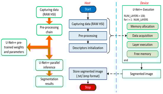 Figure 2 shows the outcome of the custom development. Code execution starts on the CPU, the Host. The HS epidermal lesion image was captured, and the neural network weights acquired. Once all the necessary elements and descriptors were initialized, we moved to the device memory, namely the GPU memory, the data needed from the U-Net++ for inference. Due to the limited memory of the Jetson GPU, we arranged the prediction to compute a layer output at that time. Specifically, we allocated memory to each layer, acquired the previous dataflow outcome, executed the layer, produced the new result, and finally, we freed the memory. Once the loop ended, a segmented image was obtained, which we moved back to the Host, where the result was saved and displayed on the handheld device. The semantic segmentation of HS skin cancer images is performed in less than a second.