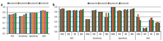 Discrimination between benign and malignant lesions offered stable and robust measurements, meeting sensitivity and specificity above 80% (Figure 3a and Supplementary Table S2). We observed the ResNet3D achieving the best results (87% sensitivity and 88% specificity). Furthermore, we can determine through AUC outcomes that the performance could be increased by over 90% using adequate thresholding. On the other hand, the multilabel classification retains an MM, BE, and BM sensitivity performance below 80%. Nonetheless, the specificity for all classes is above 80% (Figure 3b and Supplementary Table S3). Considering that having more groups induces each group to have fewer examples, the diminished number of images in the BE and ME categories elicits sparse information regarding inter-patient variability. The multilabel classification scenario demonstrated the ResNet50 and the ResNet3D as having the best performances. A drawback of considering an aggregated validation set, i.e., the union of each k-fold test set, is the risk of having inconsistent AUC results. Indeed, researchers usually compute AUC over a single classifier, whose prediction probability retains a classification. Aggregating the results means we unify possibly disharmonious likelihoods from different classifiers trained at each k-fold iteration. That is why we observed acceptable classification metrics measurements related to the low AUC.