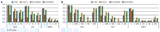 Performance of the epidermal lesion segmentation. (a,b), Binary and multilabel segmentation performance of the four different approaches, respectively. The acronyms have the following meanings: Skin (S), Benign (B), Malignant (M), Benign Epithelial (BE), Benign Melanocytic (BM), Malignant Epithelial (ME), and Malignant Melanocytic (MM).