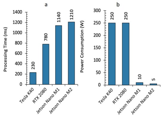 Deployment performance. (a) Processing time and (b), power consumption comparisons of the different NVIDIA GPUs considered in this study. Jetson Nano M1 and Jetson Nano M2 indicate the two possible power configurations of the Jetson Nano board, which are 10 and 5 W of power budget, respectively.