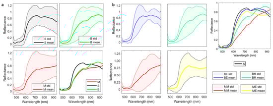 Mean and standard deviation (std) of the spectral signatures of the HS dataset. (a) Spectral signatures of skin, Benign and Malignant; (b) Spectral signatures of benign epithelial and melanocytic and malignant epithelial and melanocytic. S: Skin, B: Benign; M: Malignant; BE: Benign epithelial; BM: Benign melanocytic; ME: Malignant epithelial; MM: Malignant melanocytic.