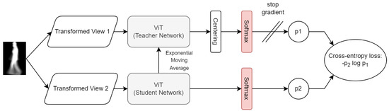 In DINO [20], the knowledge distillation with no labels is used. The DINO framework consists of two networks—teacher and student —that share the same architecture but different parameters, and , respectively. The goal of the student network is to match the probability distribution of the teacher network. The method uses a multicrop strategy [34] during training, where for every input image two global views are generated (about of the input image), along with several local views of the same image (less than of the input image). The global views pass through the teacher network while the global and local views both pass through the student network. The cross-entropy loss is used to measure similarity between output vectors from the teacher and student network. The student parameters are learned by minimizing the cross-entropy loss with stochastic gradient descent, while the teacher parameters are defined as an exponential moving average of the student parameters. In that way, the framework is able to gradually learn useful features from input images, learning the global to local correspondences from different views of the same image. Further, in contrast to many SSL methods [18,19], DINO does not require negative samples, which greatly simplifies the training procedure.