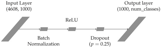After the DINO feature extractor model is trained, the gait features for gallery and query image can be extracted and used for classification. In order to classify the features, we propose using a simple FCNN classifier. Accordingly, we set the gait recognition problem as a gait classification problem, where the gallery acts as training data for the FCNN classifier and query acts as test data. For example, if a gallery contains 100 subjects we consider that a classification problem with 100 classes. We design a simple FCNN—depicted in Figure 3—that consists of two linear layers, together with batch normalization, ReLU activation function, and dropout. The hyperparameters of a proposed FCNN are determined empirically. Additionally, we use the center loss [38] to further facilitate learning a more diverse feature representation. The main loss used is the cross-entropy loss, and the combination with center loss is given by the formula