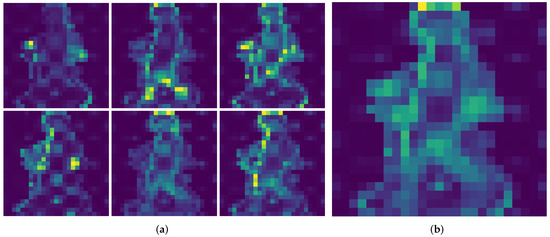 Self-attention of the CLS token on random OU-MVLP sample image. (a) Self-attention heads. (b) Average of all self-attention heads.