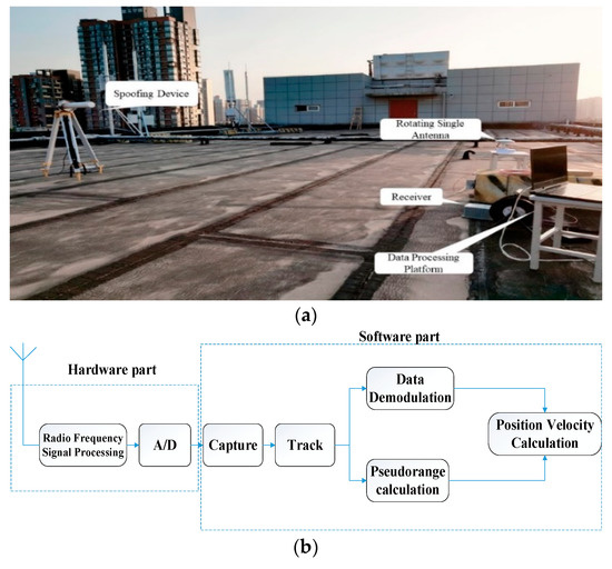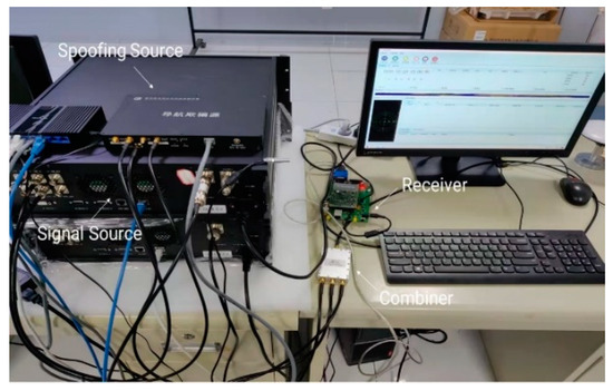 In this section, the effectiveness of the proposed spoofing detection method is verified by conducting real GNSS spoofing attack experiments on real-time receivers. The experimental scene is shown in Figure 5. The forwarding spoofing device consists of a GNSS signal transponder, a receiving antenna, and a spoofing signal transmitting antenna. The spoofing detection platform consists of a NovAtel702 receiving antenna with a rotating control platform, a receiver, and a data processing platform. We set the angular velocity of the rotary table, and the sampling frequency is .