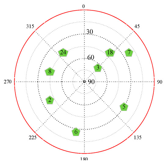 GNSS star map. The green pentagons represent the observed satellite signal, and the number above represents the satellite serial number.