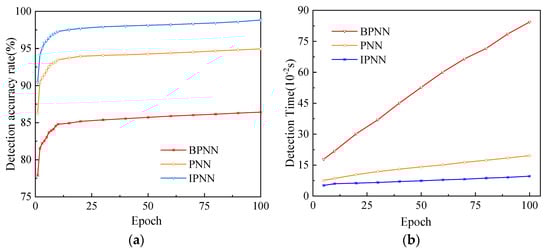 As the number of epochs increases, the accuracy rates of the three detection models gradually increase, reaching the maximum value when the number of sample epochs is 100, and the detection time of each model does not exceed 1 s, which can basically meet the requirements of real-time detection. When the training samples and test samples are the same, compared with the BPNN and PNN models, the IPNN model has the best detection effect and the shortest time. When the number of sample epochs reaches 100, the detection accuracy of the IPNN model reaches 98.84%, the PNN model is 94.95%, and the BPNN model is only 86.42%; the IPNN model has a faster convergence speed, and the training time is also significantly improved. The detection time is only 0.0963 s, which is 49.1% of PNN and 11.4% of BPNN.