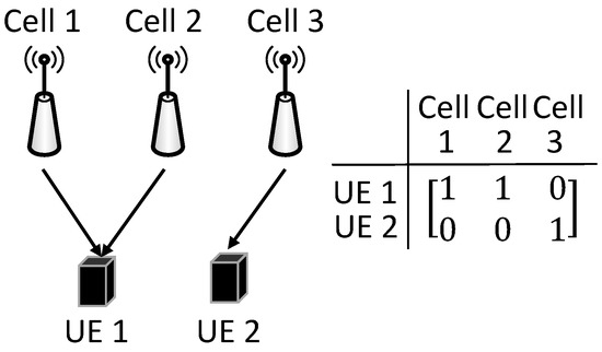 A typical genetic algorithm includes population initialization, evaluation, selection, crossover, and mutation [31]. The population initialization function is to create initial solutions, called individuals, and each individual is encoded as a chromosome to represent the solution. Figure 1 shows example of a two-dimensional chromosome matrix used to represent a solution of the JT grouping problem. In this example, the JT group of UE 1 consists of cells 1 and 2, and the JT group of UE 2 consists of cell 3.
