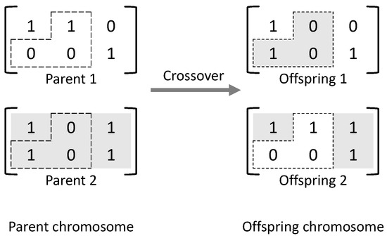 The evaluation function evaluates an individual’s fitness, which is calculated according to the objective function that measures the quality of a solution. After the evaluation, the individuals are appropriately selected as parents used for the following crossover and mutation. The selection operation stochastically selects individuals by the roulette-wheel selection based on fitness [32]. The individuals with higher fitness values are more likely to be chosen.