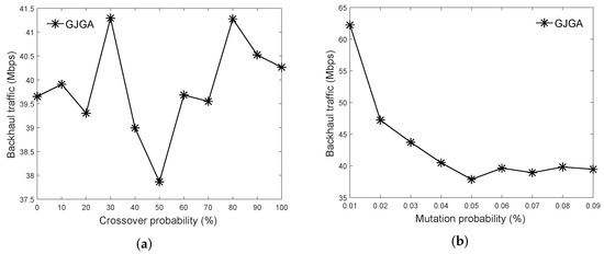 Figure 3 shows the effects of the different crossover and mutation probabilities on the total backhaul traffic under the proposed genetic algorithm. As shown in Figure 3a, different crossover probabilities slightly affect the total backhaul traffic, approximately between 37.8 and 41.2 Mbps, when the number of generations is 1000. Based on our simulation results, we set the crossover probability to 50%. As shown in Figure 3b, when the mutation probability is 0.05%, the proposed algorithm exhibits the best performance. Therefore, we set the mutation probability to 0.05%.