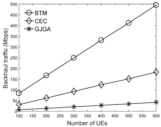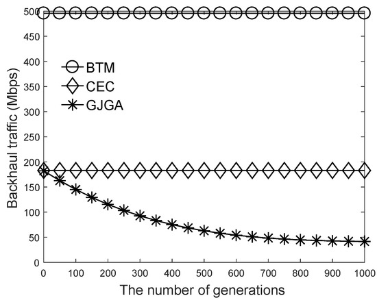 Figure 4 evaluates the performance of the proposed algorithm for each generation. Because we adopt the solution of the CEC algorithm to generate our initial solutions, we can see that the CEC and GJGA algorithms have a similar performance in the first generation. As the number of generations increases, the total backhaul traffic decreases under the GJGA because our proposed algorithm finds better solutions in each iteration. When the number of generations is higher than 265, the backhaul traffic is lower than 100 Mbps, and the GJGA can reduce the backhaul traffic about 45.3% compared with the CEC. After 400 generations, the performance improvement ratio of our proposed genetic algorithm is lower than 0.1% at every generation. There is a trade-off between the execution time and the algorithm’s performance.