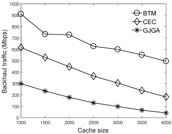 Figure 5 shows the effects of the cache size on the total backhaul traffic. When the cache size increases, the total backhaul traffic under the three algorithms is reduced because more files can be stored in the cells and be transmitted by cells without consuming the backhaul bandwidth. Our proposed GJGA algorithm can significantly reduce the total backhaul traffic consumed by the cells because it iteratively finds a suitable JT group for each UE to use the files caching in each cell efficiently. Therefore, when the cache size is larger, the performance improvement of the proposed algorithm is more evident. Although the BTM algorithm does not consider caches at cells, the backhaul traffic can still be decreased. This is because a requested file is more likely to be hit in the caches when the cache size is larger. Our proposed algorithm can reduce the backhaul traffic by up to 91 and 77% compared to the BTM and CEC, respectively.