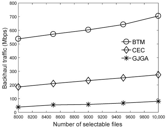 Figure 7 shows the number of selectable files for the total backhaul traffic. When the number of selectable files increases, the total backhaul traffic increases under the three algorithms. When the cache size is given, more selectable files mean that lower ratios of files can be cached at each cell so that fewer files requested by UEs can be transmitted from the caches of the cells. The simulation result shows that the proposed algorithm still has the best performance with the minimum backhaul traffic because the GJGA can efficiently use the cells’ caches to reduce the backhaul burden under the limited RBs, even when some files may be rarely cached at a few cells. The proposed genetic algorithm considering caches finds a JT group for each UE to minimize the backhaul traffic. Our proposed algorithm can reduce the backhaul traffic by up to 92 and 79%, compared to the BTM and CEC, respectively. The performance improvement of the proposed genetic algorithm is more evident with fewer selectable files.