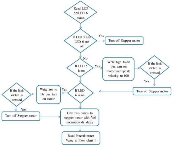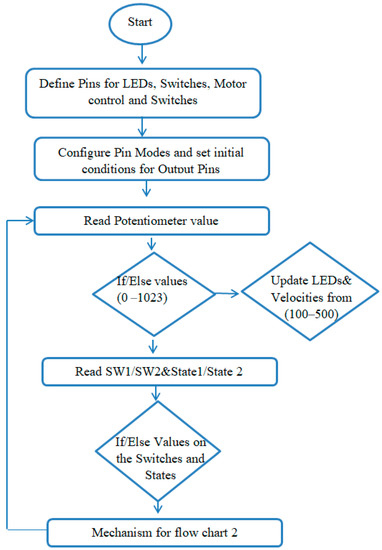 As shown in Figure 3 and Figure 4, potentiometer was assigned with different range of values of the LEDs, and for each LED a particular value of the velocity was defined. LED value range is defined between (0–1024), along with velocity range for four velocities between (100–500). The function first reads the particular value of the LED; if it is high and other values are low, it executes the particular velocity and reads the switch 1 (S1) and switch (S2) states.