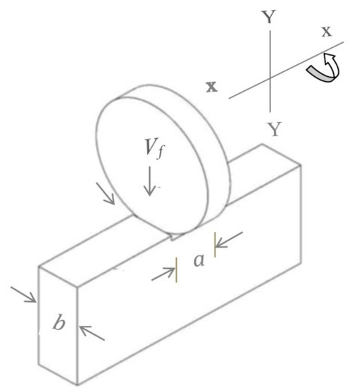 where Vf is a function of the speed of the stepper motor and Ac is the product of the cutting thickness and width of the specimen, as shown in Figure 6 [5]. The downward feed speed in relation to stepper motor speed was determined by conducting the kinematic study using generalized coordinates [33]. It was revealed that at a constant rotation speed of the stepper motor, feed speed was perpendicular in relation to the workpiece, and remained constant throughout the cutting cross section.