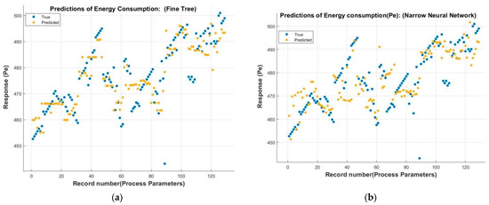 The predicted values of electrical energy consumption, which were trained with input process parameters, are shown in Figure 8.