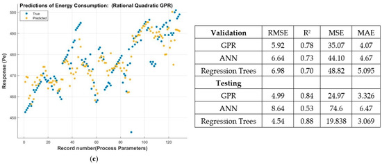 These figures show the results of about 130 measurements based on approximately 35 experiments to evaluate energy consumption (Ee) based on process parameters. The general increasing trend of energy consumption is in agreement with the previous research on grinding [5]. The results of selected features for validation and testing for Gaussian process regression (GPR), regression trees, and artificial neural network (ANN) are shown in Figure 8. Figure 9 shows the true vs predicted response of the adopted model.