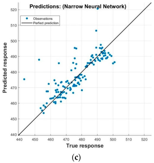 True vs predicted response. (a) GPR, (b) regression trees, (c) ANN.
