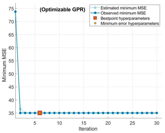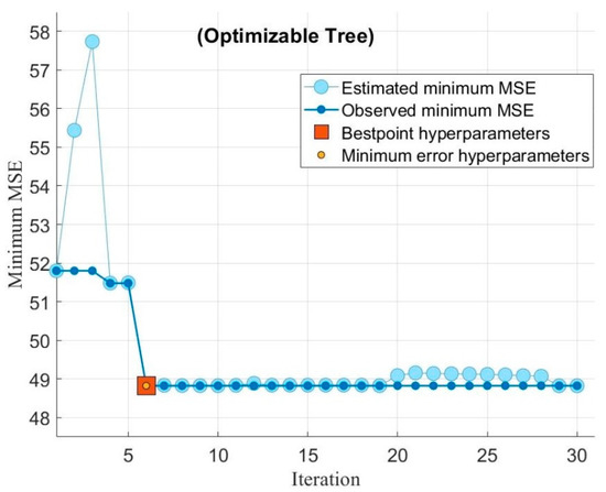 To improve the performance of the existing models, hyperparameter optimization was performed by using Bayesian optimization with the objective of minimizing the cost function of MSE, as shown in Figure 10 and Figure 11. The data set for this experiment is small, so the default number of iterations and time limit is used. The blue line shows the minimum MSE calculated by the optimization process, considering all the hyperparameter values. The dark line represents the observed minimum MSE at a particular time; for instance, at a fifth iteration, the dark line will show the minimum observed MSE in the first five iterations.