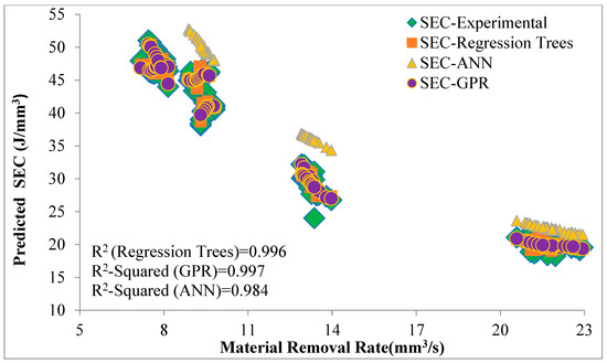 Using this predicted cutting power (Pm) and predicted values of material removal rate, specific energy consumption (SEC) was predicted and validated. Figure 12 shows the validation of energy consumption values in terms of evaluation of specific energy consumption. The high value of the coefficient of determination R2 for predicted specific energy consumption (SEC) indicates that the chosen models, even with moderate performance (R2 values between 0.7–0.78), can be good enough to accurately predict the associated values of energy consumption, such as cutting power, specific energy consumption, etc. The specific energy consumption decreases with an increase in material removal rate; this behavior is similar to the previous research on grinding [5,38,39] and also validates the accuracy of predictions. It can be seen that at a low material removal rate, the predicted values of the three algorithms are scattered, but as the material removal rate increases, values become closer to each other.