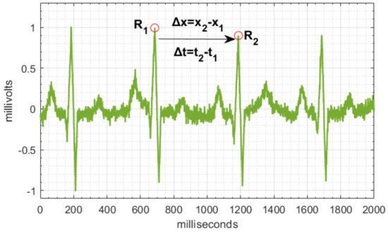 According to this analogy, the ratio of the speed change in the peak can be obtained when this “travels” an x distance, that is, the acceleration of the heart rate shown in Equation (3). Then, in the form of HR acceleration, an HRV expression is obtained almost immediately, which does not depend on the time windows (T-period of analysis) but only on changes in two points or velocities (HR), which makes it different from the temporary HRV (Equation (1)).