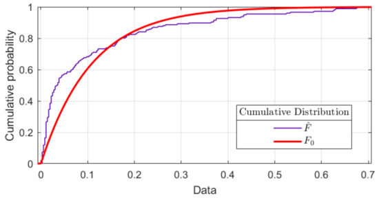 Here, the empirical and theoretical distributions and are compared through Kolmogorov–Smirnov’s distance, obtaining the deviation of two empirical cumulative distributions, or a function of a reference theoretical cumulative distribution. This parameter was used because of its sensitivity to differences in location, as in the cumulative distribution function. Kolmogorov–Smirnov’s distance is defined by Equation (5).