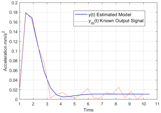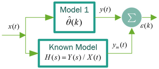The input and output variables of the system are known and represent the excitation and response of the theoretical model; however, there is a causality relationship between this input signal and the output signal . This allows the correlation between and based on the transfer function. The IV method uses the regression model given by Equation (7) [31,33,61]. Here, is a known parameter of the system and the output of the system is a vector of dimensions that have known parameters and are related to the input of the system, is an vector of unknown parameters (transfer function). In turn, is the discrete sampling time of the variables under study.