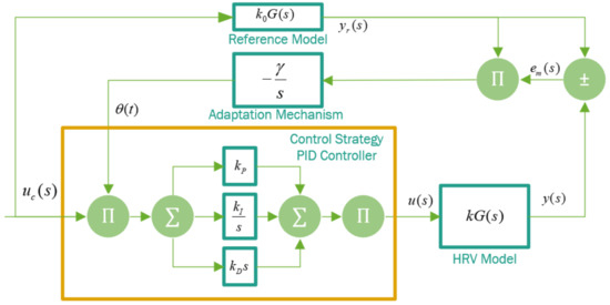 As the output is a single variable, in which the gradient of the term tends to zero, and as the reference model does not depend on the calculation of the tracking error gradient is reduced to the partial derivative of the heart rate acceleration model in the closed loop with respect to the parameter of the control law , as shown in Equation (16).